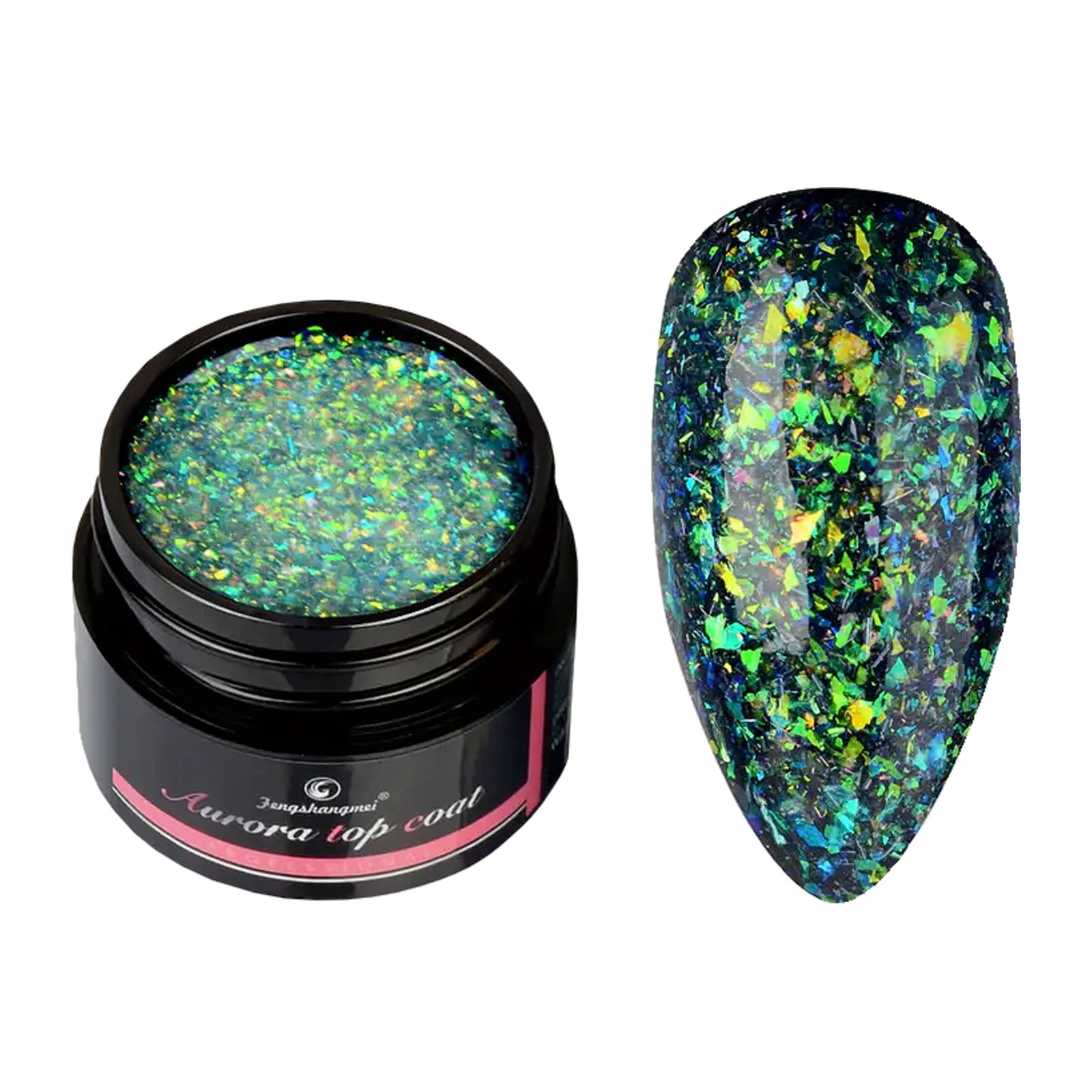 FSM Aurora Top Coat is a transparent top with sparkling glitter particles.